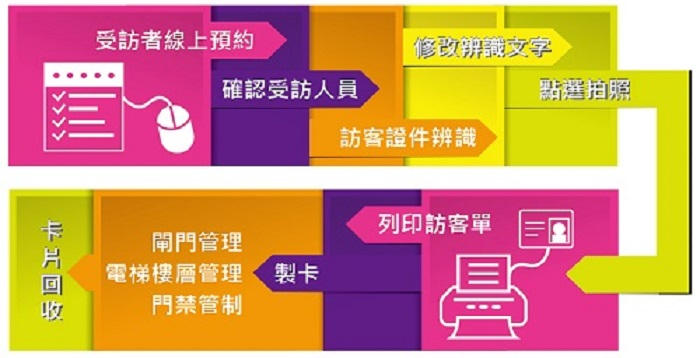 完整的訪客管理系統,包含了受訪者登錄系統、證件辨識存檔、拍照存檔、列印訪客單、發卡作業、閘門進出管理、卡片回收管理、各地點門禁或電梯樓層的管制等,因此一套完善的訪客系統,不再只是單純的針對訪客門區進出作管制。更可延伸至區域門禁或樓層控管,上下班人員進出記錄收集,訪客人員的活動記錄收集,存檔,報表列印等,有效的管制訪客的活動並掌握訪客的動向,不但能精準辨識資料,更能省下大量資料比對與查核的人力與時間。