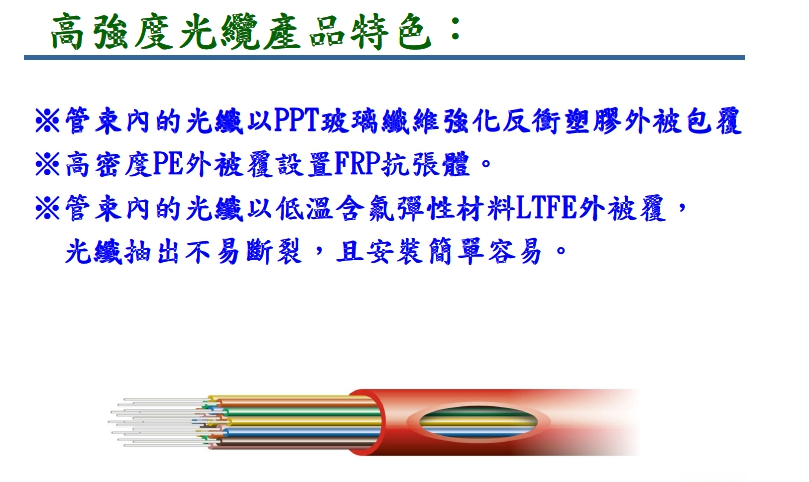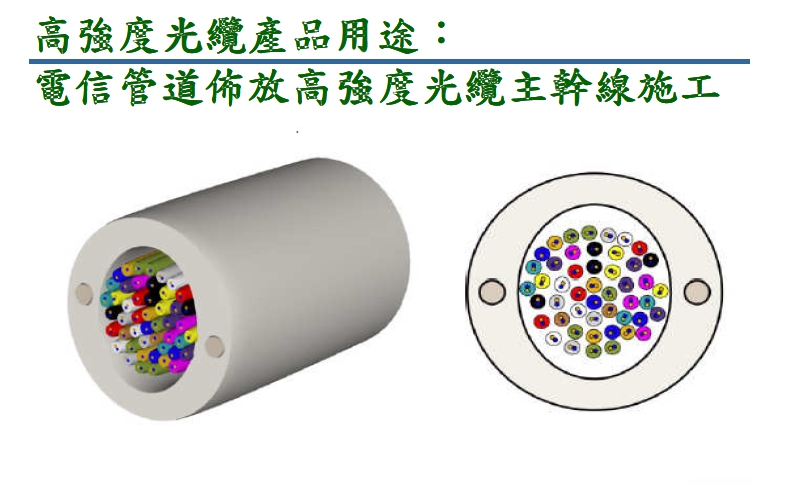 高強度耐彎光纖以3M特有的GGP 技術作成,經過數年消費市場的嚴苛歷練,已成功獲致客戶滿意度的肯定,高強度耐彎光纖的光纖表面張力在相同的彎曲情況下比傳統光纖少20% ,可應用在高度彎曲的產業環境中,即使安裝在小於0.5 公分的彎曲半徑下,超過20年仍不會斷裂。高強度耐彎光纖的優越特性與功能可適用於電腦硬體、元件、器械中小而彎曲的空間,未來將使電腦、通訊和消費性電子產品的光電介面應用,更加快速地普遍化和標準化。